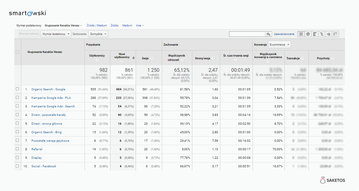 Saketos to marka, która bardzo świadomie podchodzi do roli analityki w marketingu i internetowej sprzedaży. Możemy to powiedzieć bez choćby nutki fałszu – jako agencja współpracujemy już od kilku lat, a ponad rok temu na blogu Verseo pojawiło się case study dokumentujące wyniki przy kampaniach Google Ads, które prowadziliśmy (i wciąż prowadzimy) dla tej marki.